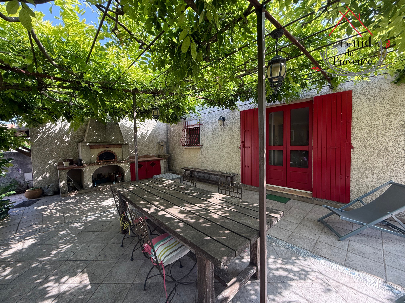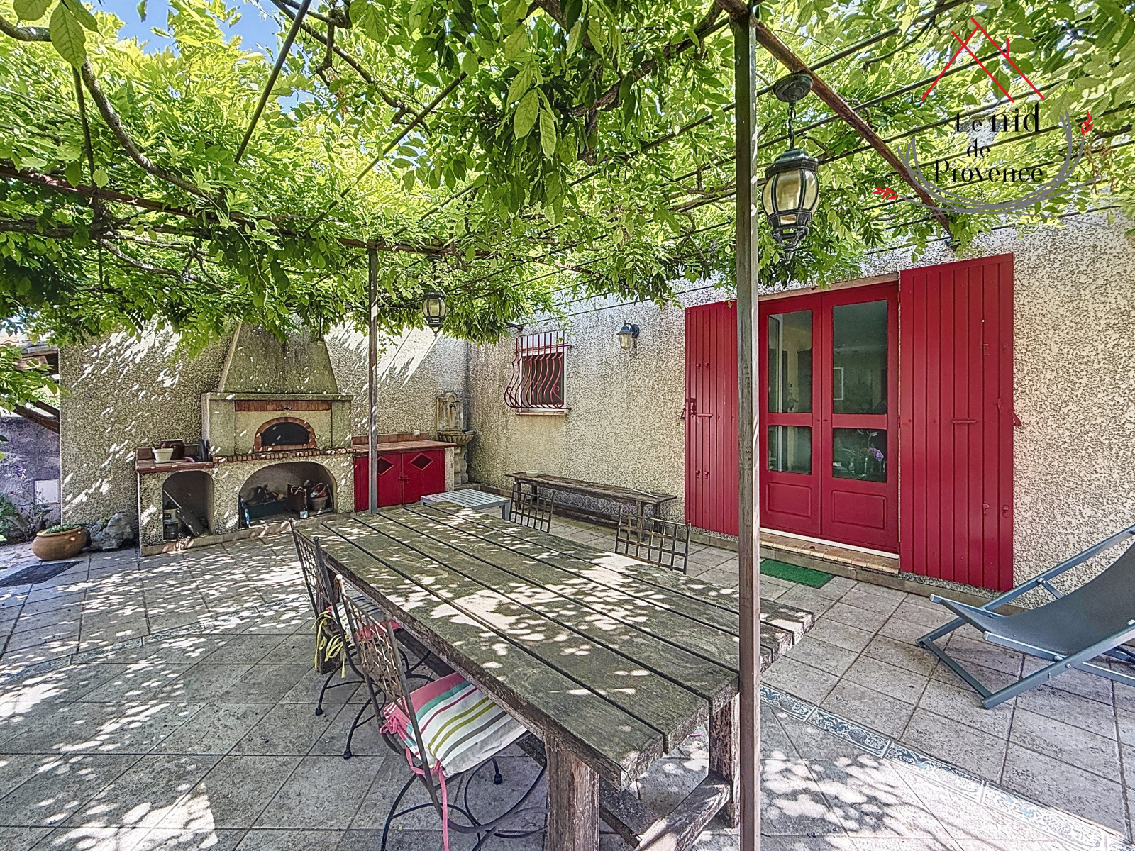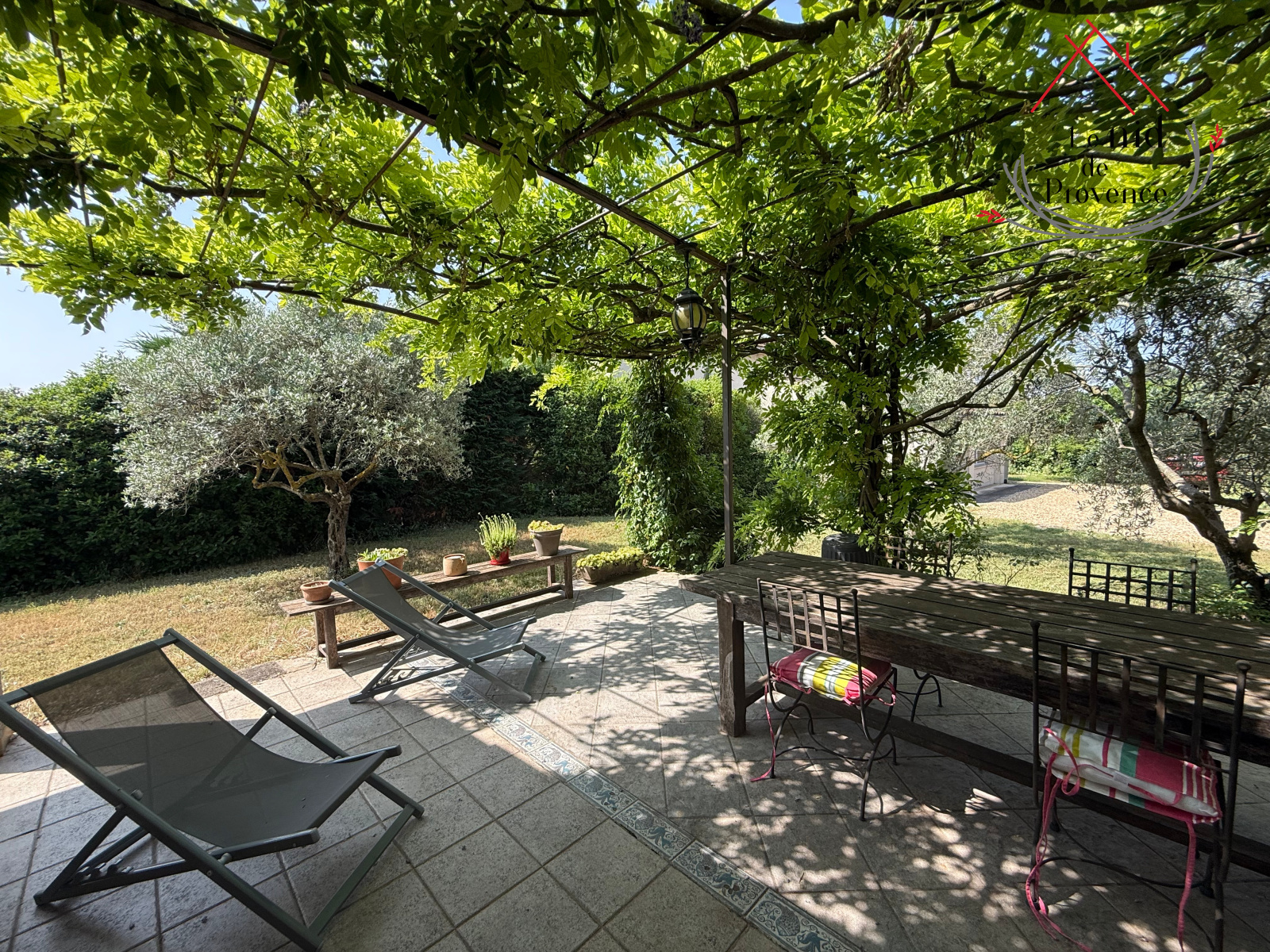 À l’extérieur, le jardin soigneusement arboré propose de véritables espaces de vie. Vous pourrez notamment vous détendre sous une tonnelle provençale ombragée par une glycines, idéale pour profiter des journées d’été à l’abri du soleil.